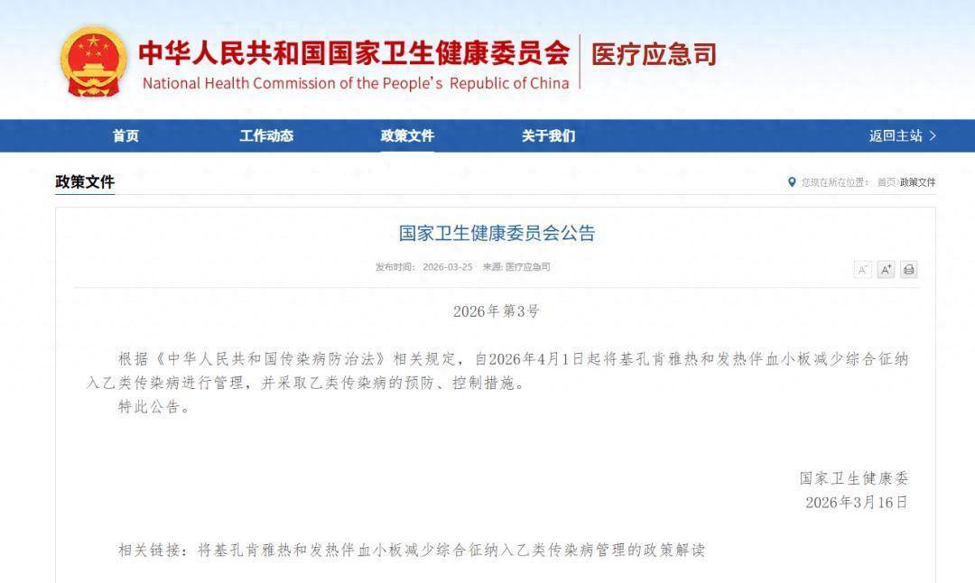 (人民日报健康客户端记者 徐婷婷 谭琪欣)国家卫生健康委3月25日发布公告,自2026年4月1日起将基孔肯雅热和发热伴血小板减少综合征纳入乙类传染病管理,采取相应预防、控制措施。